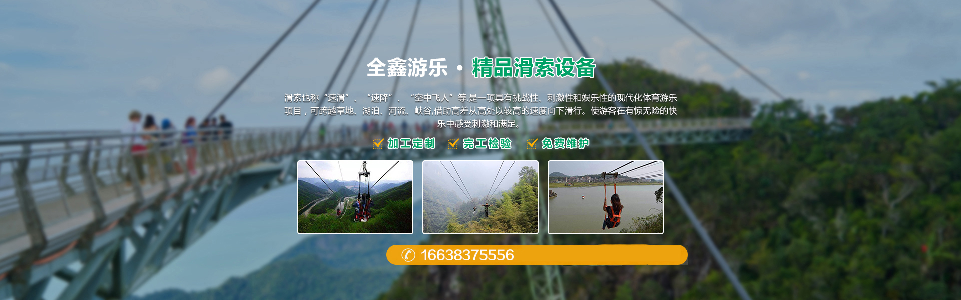 新鄉市全鑫游樂設備有限公司位于美麗的太行山邊新鄉市亢村工業園區,該公司是以“研制、生產、安裝、銷售、售后服務”一體化的企業,擁有一支愛廠敬業、專業的技術隊伍,足跡遍及全國各地的銷售精英,迅速快捷,服務周到的售后服務體系。公司主要經營滑索、玻璃吊橋、木板吊橋、滑道、滑草、趣橋、拓展訓練、及所需鋼結構的制造、安裝、設計、維修、銷售,另外為景區提供景觀設計、水壩包裝、滑漂線路勘察、設計等工程.技術力量雄......